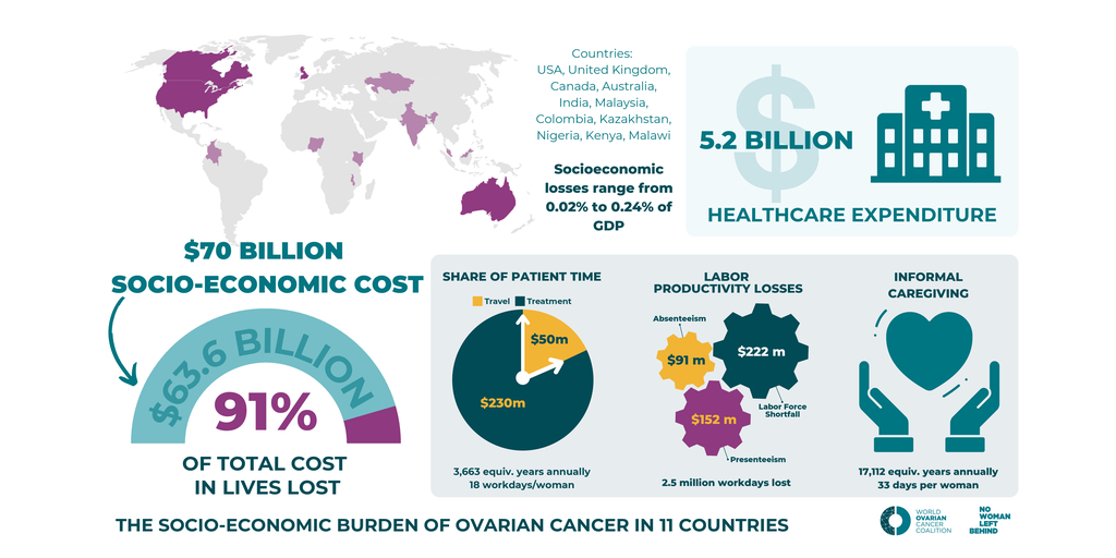 Published in JCO Global Oncology, a leading peer-reviewed medical journal, the landmark “Socioeconomic Burden of Ovarian Cancer in 11 Countries Study” reveals the staggering $70 billion burden of ovarian cancer, with over 90% of these costs resulting from lives lost. The study examined data from a diverse group of countries representing a range of income levels: Australia, Canada, Colombia, India, Kazakhstan, Kenya, Nigeria, Malawi, Malaysia, the United Kingdom and the United States.